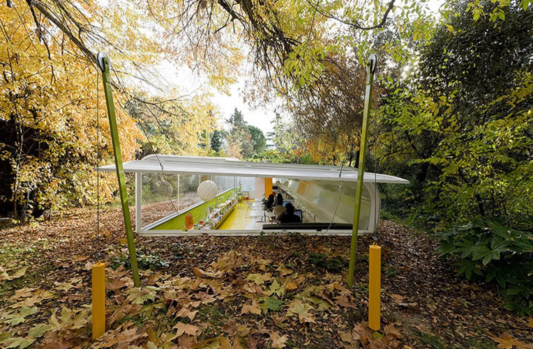 The Selgascano Studio in Madrid Spain designed by Jose Selgas and Lucia Cano allows people to work under the trees. A transparent part was positioned on the north side to avoid the direct sunlight in work areas. The rest of the structure is solid shielding from direct sun.