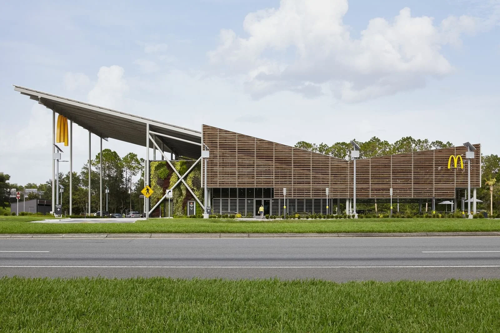 Pictured is the Orlando flagship McDonald’s designed by Ross Barney Architects. It’s designed with regard to how it responds to Orlando’s subtropical climate. The building is naturally ventilated for a majority of the year by large, sensor-controlled glass jalousie windows that open and close automatically based on temperature and outdoor humidity. Roughly 65 percent of the time, the building can be cooled without air conditioning.